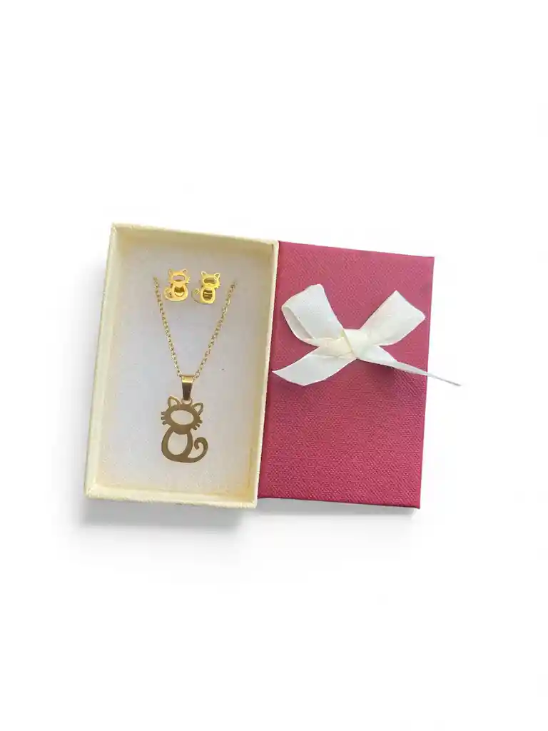 Juego De Aretes Tipo Topo Con Cadena O Collar Diseño De Gato Color Dorado