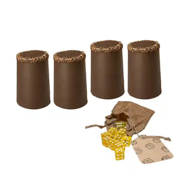 Juego de cacho cuero sintético cafe x 4 jugadores y 20 dados. Ideal para tus partidas de mesa. Diviértete con tus amigos con el juego de cacho Nards diseñado para ser un accesorio de lujo en cuero vegano. El juego de cacho viene con 4 vasos y 20 dados, tejido a mano en cuero vegano.