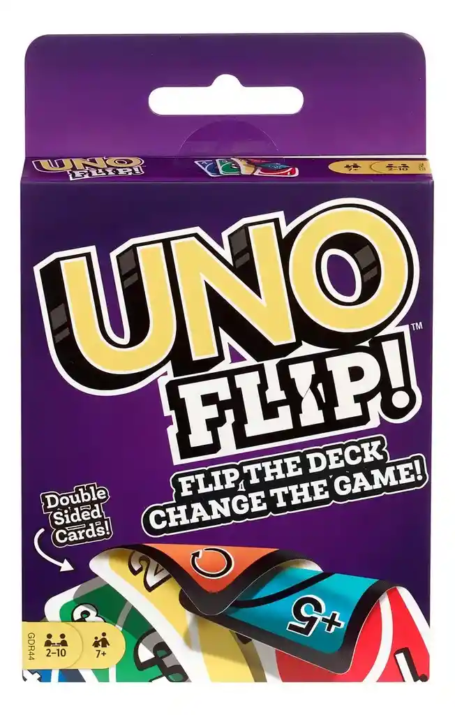 Uno flip, es tu juego favorito de cartas pero ahora con cartas que puedes jugar por los dos lados, simplemente tira la carta de cambio de lado y empieza a jugar un juego completamente nuevo. Uno Flip! Juego de cartas ¡Cartas de 2 caras! ¡Voltea las cartas y cambia el juego! con la Carta Flip Tira una carta flip para que todas las cartas cambien del lado oscuro o viceversa. Tira la carta flip. Voltea tus cartas. Características Jugar con el lado claro es como jugar al juego clásico de uno ¡El lado oscuro incluye castigos más severos! ¡'Toma una' en el lado claro se convierte en 'Toma cinco' en el lado oscuro! ¡'Bloqueo' en el lado claro se convierte en 'Bloqueo a todos' en el lado oscuro¡ Solo puedes cambiar de lado con otra carta Flip. ¡Se trata de una clásica batalla de doble cara que te mantendrá en suspenso! Para 2 a 10 jugadores.