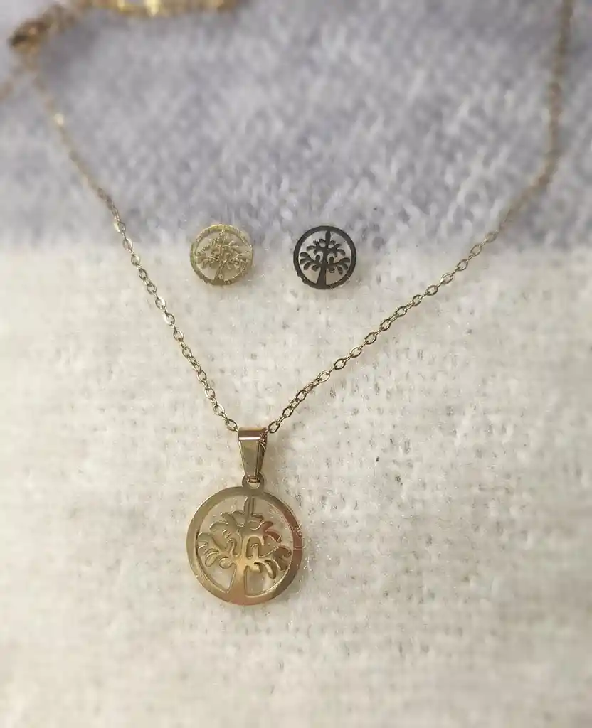 JUEGO DE COLLAR Y ARETES DE ACERO INOXIDABLE - FORMA DE ARBOL DE LA VIDA