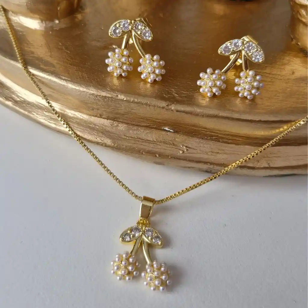 Presentación: Set de Collar y Aretes de seguridad Material: Rodio Color: Dorado Diseño: Cereza blanco Cadena de 40cm ajustable Características: Hipoalergénico El rodio es un material que no se oxida No se oscurece con el tiempo, su tonalidad y brillo no se alteran No necesita mantenimiento Se recomienda no aplicar perfume directamente