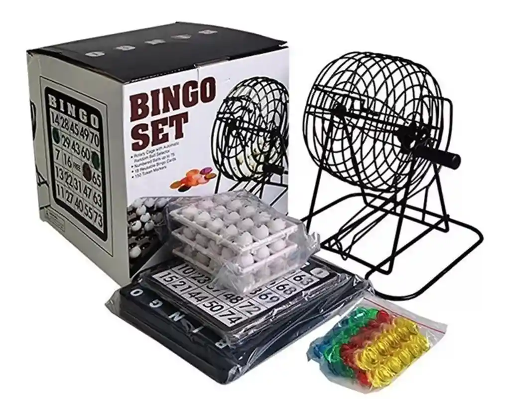 Bingo balotera metálica ============================== Juego divertido: bingo adecuado para niños y adultos para 2 a 18 jugadores instrucciones en inglés. Para jugar con los amigos: juego de bingo para la próxima excursión o viaje con la familia o amigos. Ideal para transportar: bingo manual pequeño que ocupa poco espacio cartones reutilizables con fichas. Características: bombo con peana estable y manivela tablero para dejar las bolas fichas para tapar. Detalles: bombo metal 20 x 17,5 x 21,5 cm, pesa 1 kg 75 bolas 2 tableros 18 cartones 150 fichas. Contenido del paquete: 1-Set bingo.