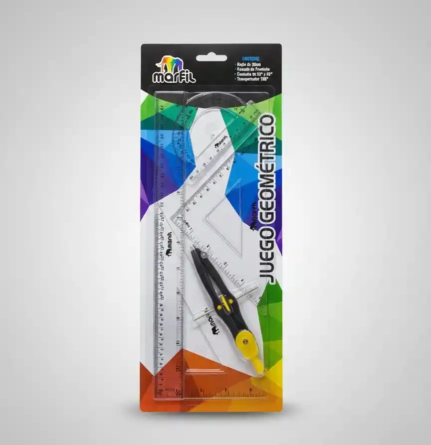 📐 Juego Geométrico Marfil con Compás Juego geométrico completo de la marca Marfil, ideal para estudiantes y uso escolar. Diseñado para realizar mediciones, trazos y figuras geométricas con precisión. ✨ Contenido del set: Regla graduada Escuadra Cartabón Transportador Compás con ajuste preciso 🧩 Características: Elaborado en plástico transparente y resistente, permite una fácil lectura de las medidas. Graduaciones claras y exactas. Compás práctico y funcional para círculos y trazos geométricos. Presentación en empaque blíster, ideal para exhibición y protección del producto. 🎒 Uso recomendado: Perfecto para estudiantes de primaria y secundaria, tareas escolares y clases de geometría. Un set básico, completo y confiable para el día a día escolar ✏️📏