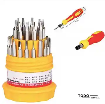 🔧 Kit de Destornilladores de Precisión 31 en 1 🔩 🛠️ Herramienta multifuncional para trabajos de precisión. Incluye un destornillador con mango ergonómico de goma y 30 puntas magnéticas intercambiables. 📏 Tamaño: Altura: 125 mm Diámetro: 50 mm 🔹 Características: - Mango antideslizante para un agarre firme - Hecho de acero de aluminio cromado resistente - Puntas mecanizadas con ajuste preciso - Soporte universal para fácil organización 🔸 Incluye: 🔧 Planas (-): 1.5, 2.0, 2.5, 3.0, 3.0 🔧 Phillips (+): 1.7, 2.0, 2.5, 3.0, 3.5 🔧 Torx (T): T3, T4, T5, T6, T7, T8, T9, T10, T15, T20 🔧 Pentalobular (★): 2.0 🔧 Triángulo (▲): 3.0 🔧 Hexagonal (⬣): H1.3, H1.5, H2.0, H2.5, H3.0, H4.0 🔧 Tipo ""Y"" (Y): Y3.0 🔧 Tipo ""U"" (U): U2 Ideal para reparación de electrónicos, relojes, gafas, teléfonos y más. ¡Un imprescindible en cualquier caja de herramientas! 🔥
