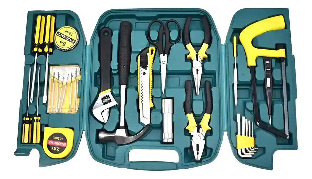 Set Herramientas PLUS: Este completo set de herramientas no solo te permite realizar múltiples tareas con facilidad, sino que también garantiza que todas las herramientas estén siempre organizadas y al alcance de la mano, gracias a su estuche robusto y compacto. DESCRIPCIÓN Este juego de herramientas es perfecto para realizar una variedad de tareas en el hogar o en el trabajo. Incluye un martillo, llave inglesa, alicates, puntas de destornillador, cinta métrica y otros accesorios esenciales. Todas las piezas encajan de forma segura en un estuche duradero moldeado por soplado, lo que facilita la organización y portabilidad conveniente del set. CARACTERÍSTICAS * Incluye martillo, llave inglesa, alicates y más. * Viene con puntas de destornillador y cinta métrica. * Ideal para una variedad de usos domésticos y profesionales. * Piezas encajan de forma segura en el estuche. * Estuche duradero moldeado por soplado. * Facilita la organización de las herramientas. * Portabilidad conveniente para llevar a cualquier lugar. * Herramientas de alta calidad y durabilidad. * Perfecto para reparaciones y proyectos de bricolaje. * Diseño compacto y fácil de almacenar. MEDIDAS Alto: 4,8 cm Largo: 31,5 cm Peso: 1466 g QUE INCLUYE LA COMPRA X1 Kit Herramienta 27 Piezas