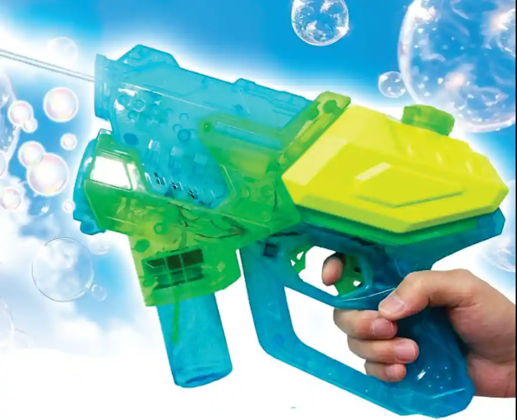 La pistola de burbujas y agua, es el complemento perfecto para las tardes de diversión al aire libre.