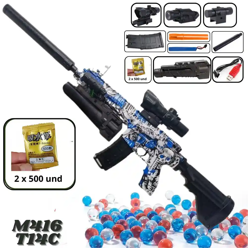 Juguete Pistola Electrica Hidrogel Con Bola De Gel M416 - T14C Azul Para actividades al aire libre, juego de equipo de tiro de lucha, pistola Blaster de Gel, pistola de juguete para regalos. Descripción: Pistola eléctrica con bola de gel Blaster para actividades al aire libre, juego de equipo de tiro de lucha, pistola Blaster de gel, pistola de juguete para regalos. Pistola M416 Blaster puede disparar hasta 200 bolas de gel por minuto. Su rango es de aproximadamente 65-80 pies (20 metros), con una velocidad de disparo de hasta 180FPS y su rápida velocidad de disparo y disparo a larga distancia pueden brindarle una experiencia muy real e interesante. Incluye: 1 * Pistola lanzador M416. 1 * batería recargable. 1 * cable de carga USB. 1 * Mira. 2 * Paq de bolas X500 Und Velocidad de disparo: 5-6 balas por segundo. Tamaño Bolas De Gel: 7-8mm. Nota: Las imágenes publicadas son de referencia, el producto real puede presentar ligeras variaciones en su tonalidad de color.