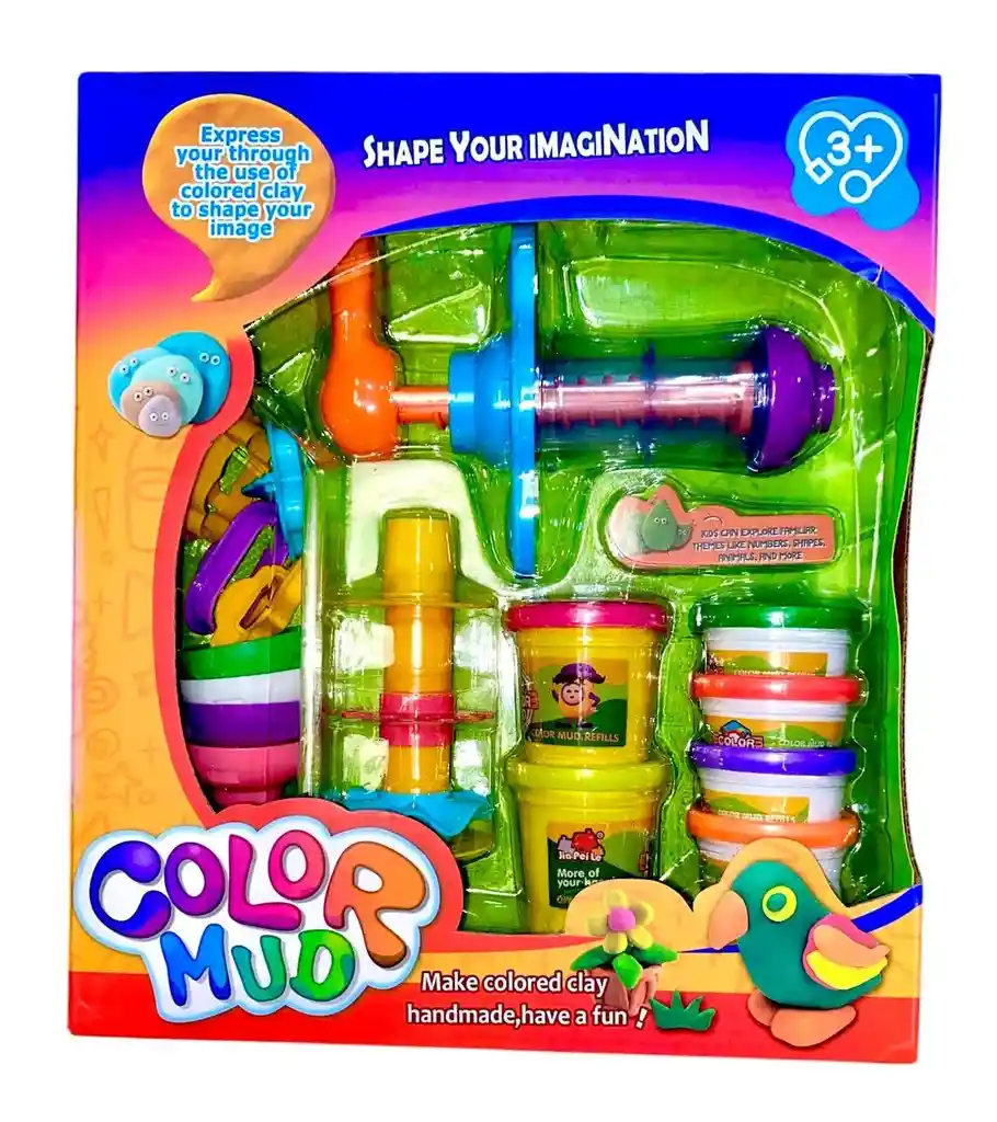 GENIAL SET DE PLASTILINA COLOR MUD, IDEAL PARA NIÑOS DESDE LOS 3 AÑOS. ADEMÁS DE SER DIVERTIDO ESTIMULA LA CREATIVIDAD Y MOTRICIDAD DE TU NIÑO. NO ES TOXICO. MEDIDAS DE LA CAJA 24.5 CM DE ANCHO X 28 DE LARGO. El kit contiene herramientas y varios colores de plastilina para que los niños puedan moldear y crear diferentes figuras.
