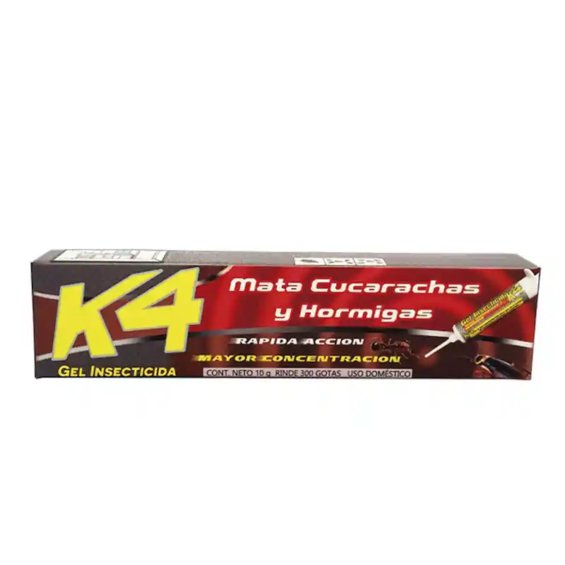 Producto de uso doméstico e industrial, ideal para aplicar en viviendas, fábricas, restaurantes, cocinas, bodegas,supermercados, oficinas. Aplique gel insecticida K4 en pequeñas gotas en lugares donde haya visto la presencia o se puedan ocultar cucarachas y hormigas, rincones, cocina, debajo y detrás de electrodomésticos grandes o pequeños, lugares húmedos como baños, lavaderos, patios, basureros. Cuidarse de no aplicar encima de mesones o mesas de trabajo. Ingrediente activo, Fipronil 0.50% Otros ingredientes c.p.s.