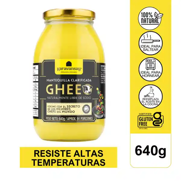 Mantequilla clarificada (ghee) elaborada a partir de mantequilla de vaca sin sal. Durante la clarificación se eliminan los sólidos de la leche —caseína y lactosa— y el agua, dejando un líquido color dorado, de textura y sabor suaves. Ideal para cocinar, freír y hornear por su alto punto de humo; no requiere refrigeración. Presentación: 640 g.