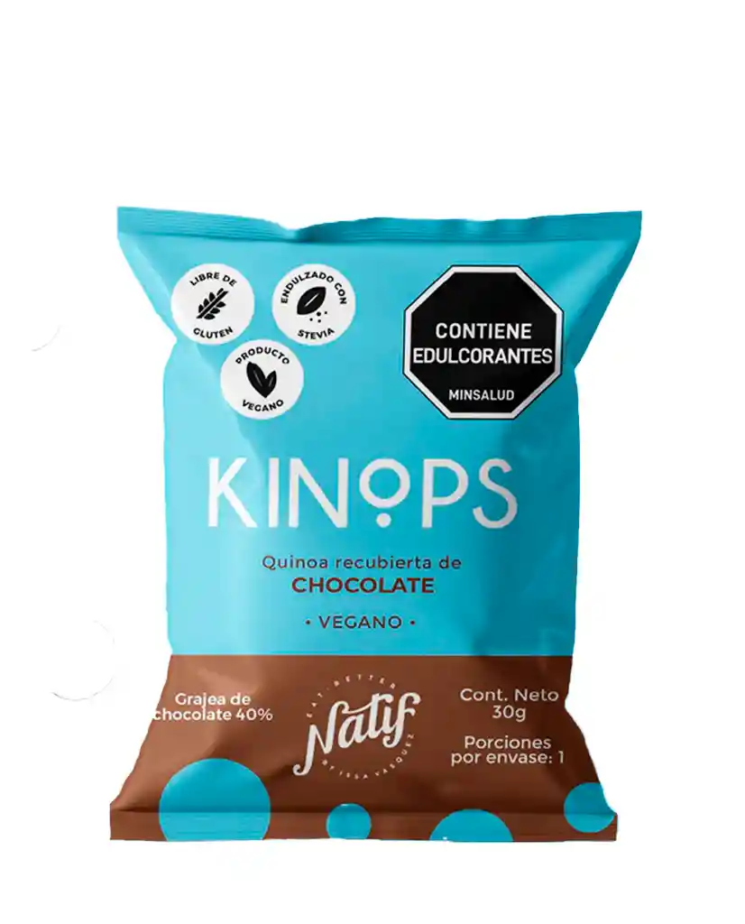 Kinops Chocolate de leche 40% Vegano Kinops Chocolate de leche 40% Vegano Quinoa recubierta de chocolate oscuro al 40%, • Sin azúcar, endulzado con stevia • Producto Vegano • Libre de Gluten Contiene: Chocolate (masa de caco orgánica, eritritol y stevia) y quinua pop. • Ideal para consumirlo como un snack saludable