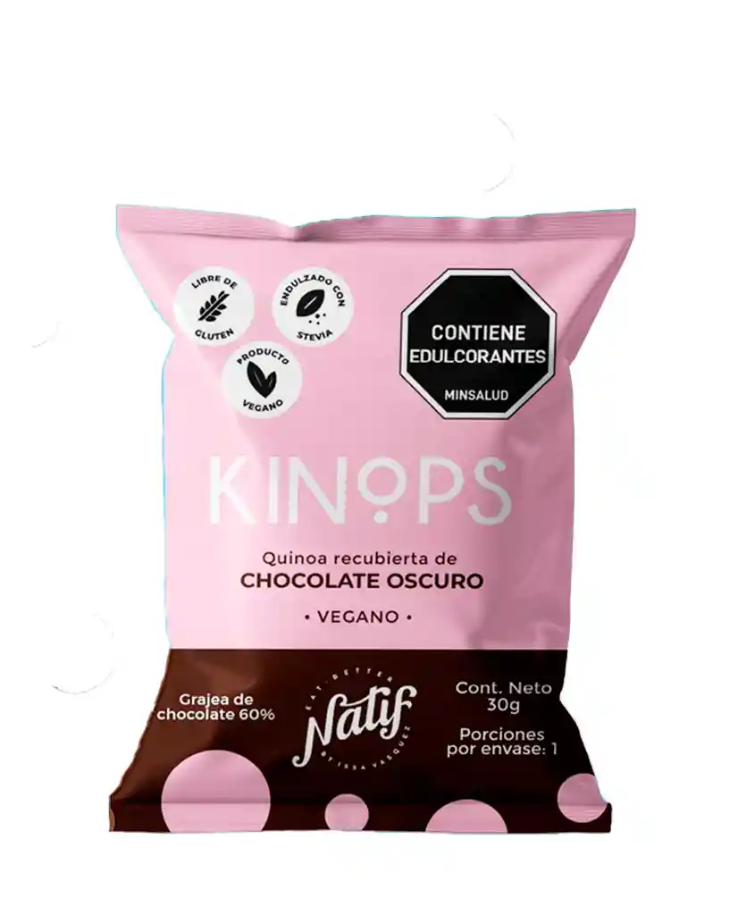 Kinops Chocolate Oscuro 60% Vegano Quinoa recubierta de chocolate oscuro al 60% • Sin azúcar, endulzado con stevia • Producto Vegano • Libre de Gluten Contiene: Chocolate (masa de caco orgánica, eritritol y stevia) y quinua pop. • Ideal para consumirlo como un snack saludable