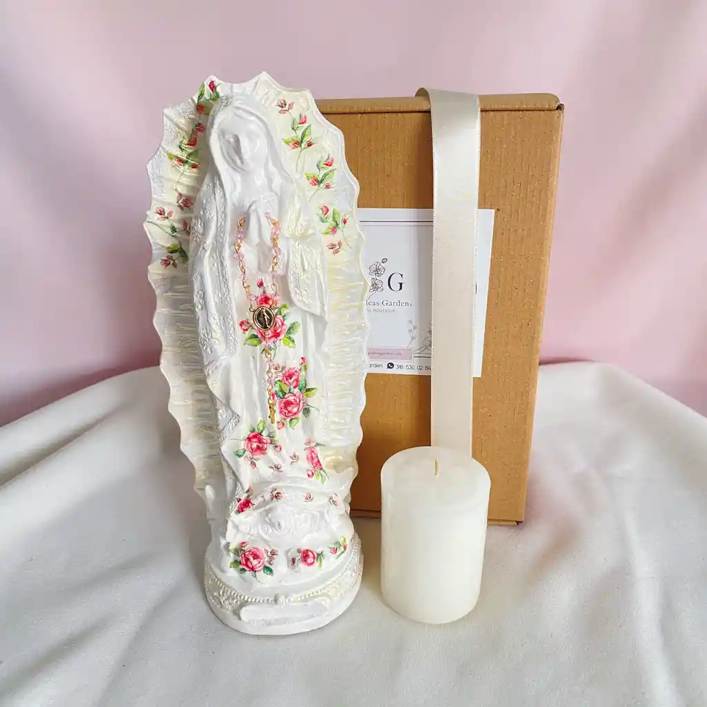 KIT CONDOLENCIAS VIRGEN 30 CMS -DENARIO Y VELA , EMPACADAS EN CAJITA CON TARJETA