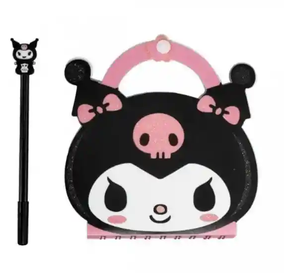Kit Cuaderno Bolso Hello Kuromi Pluma Negro Lila Hello Kuromi Libreta tipo estuche con broche en forma de kuromi + pluma bolígrafo con figura decorativa