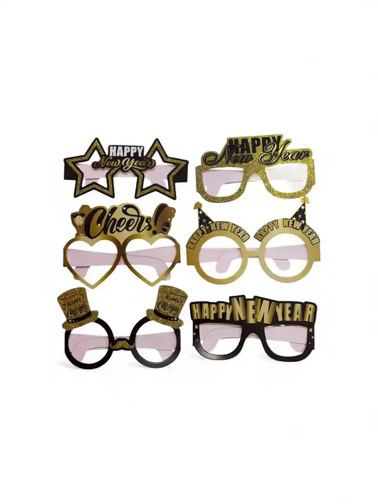 ¡El Kit De Fotos Más Divertido Para Año Nuevo! Este set incluye 6 pares de lentes y gafas de cartón con diseños variados perfectos para crear selfies y fotos grupales memorables en tu fiesta de fin de año. Diseños Exclusivos: El set contiene modelos surtidos con frases como "Happy New Year" y "Cheers!" junto a figuras temáticas como estrellas sombreros de copa y diseños festivos en color dorado brillante y negro. Material Y Calidad: Fabricados en cartón resistente con acabados en glitter (brillantina) para un look extra festivo. Son ligeros y cómodos de usar. Ideal Para: Fiestas de Fin de Año eventos corporativos cenas de Nochevieja o como accesorio divertido en cualquier celebración decembrina.