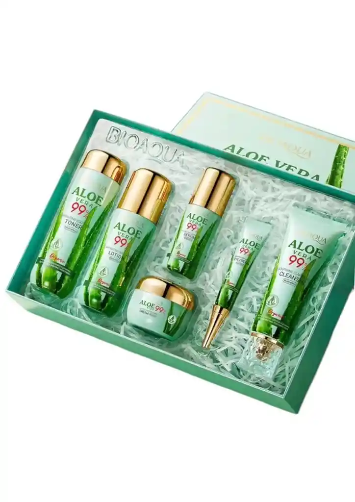 Este set integral de cuidado facial aprovecha las propiedades curativas y regenerativas del Aloe Vera con una pureza del 99%. Diseñado para una rutina completa, el kit trabaja en sinergia para limpiar, tonificar, hidratar y proteger la piel. Es especialmente efectivo para calmar irritaciones, reducir el enrojecimiento y equilibrar los niveles de humedad sin dejar sensacion grasa, proporcionando un acabado fresco y saludable. Atributos y Beneficios Tecnicos Concentracion de Aloe Vera 99%: Aporta una alta dosis de vitaminas (A, C, E) y minerales que aceleran la regeneracion celular. Accion Calmante e Antiinflamatoria: Alivia instantaneamente la piel expuesta al sol, al viento o a tratamientos esteticos agresivos. Control de Oleosidad: Hidrata profundamente la piel grasa sin obstruir los poros, ayudando a reducir la aparicion de imperfecciones. Efecto Refrescante: Proporciona una sensacion de alivio termico, ideal para climas calidos o pieles con tendencia a la rosacea. Mejora de la Elasticidad: Estimula la produccion de colageno natural, ayudando a suavizar lineas de expresion causadas por la deshidratacion. Running Shopping, Somos especialistas en Belleza ; productos 100% Originales , garantizados y entregas rapidas !