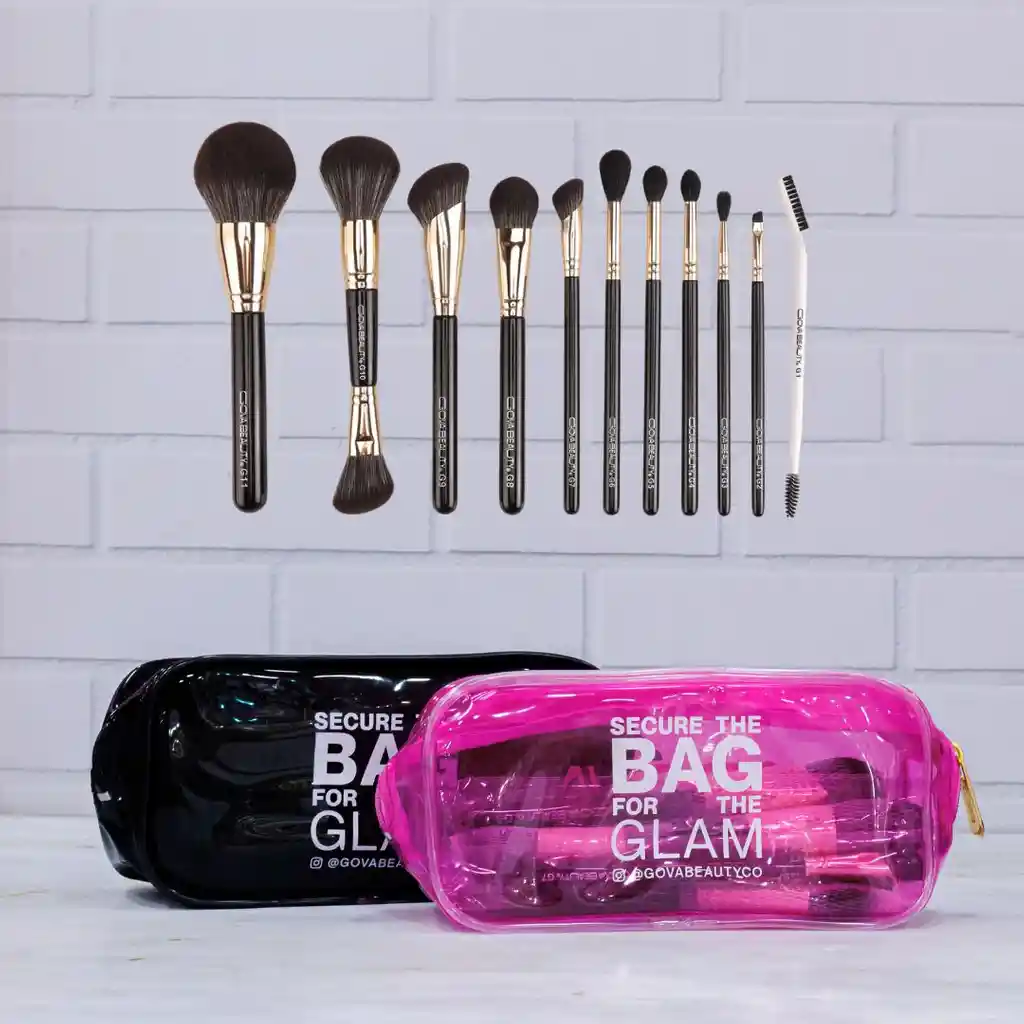Kit de 11 brochas para ojos y rostro + cosmetiquera Colores de cometiqueras disponibles: Negra y Rosada Especificar color a elegir