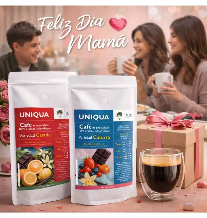 Kit de café. Kit para el día de la madre. Celebra tus ocasiones especiales y dile cuán especial es para ti con el kit de café UNIQUA. Elegante caja de regalo en cartón Kraft natural con 2 bolsas de cafés de especialidad de 150 gramos en grano (variedad Castillo y Caturra tueste medio y beneficio lavado suave) + un vaso doble pared de 250 ml versátil y una tarjeta que podrás personalizar con un mensaje único y muy especial.