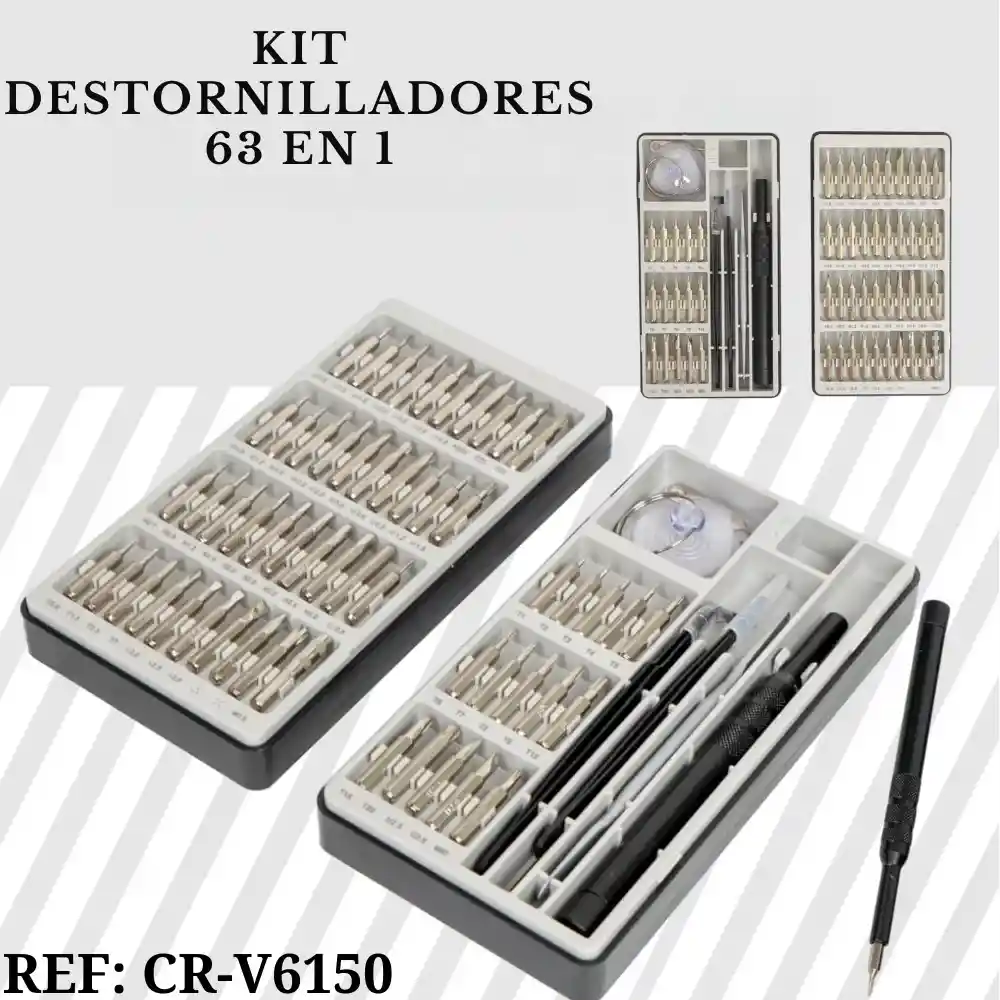 Este kit de destornillador de precisión te ofrece 63 herramientas esenciales para la reparación de ordenadores, smartphones, dispositivos electrónicos u otros objetos pequeños. Práctico y compacto. El kit incluye: 55 boquillas. 1 mango de metal. 1 x eje flexible. 1 caja de almacenamiento. 2 Pinzas de agarre. 1 Pala. 1 Mini clip extractor Especificaciones: punta Material: acero de herramientas de aleación S2.