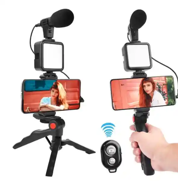 compañero de viaje perfecto para los creadores de videos que usan teléfonos inteligentes y adecuado para vloguear, hacer tiktok, Facebook en vivo, Instagram y más El kit de vlogging está diseñado para mejorar sus videos con un mejor sonido e iluminación, ya sea en interiores o exteriores. Características: 1. Diseñado para mejorar sus videos con mejor sonido e iluminacion. 2. Su micrófono mejorará la voz del sujeto mientras bloquea el ruido ambiental. 3. La luz cuenta con 49 LED con 3 configuraciones de brillo. 4. Agarre de trípode: utilícelo como un trípode o grabe sus videos sobre la marca con la capacidad de sujeción manual.