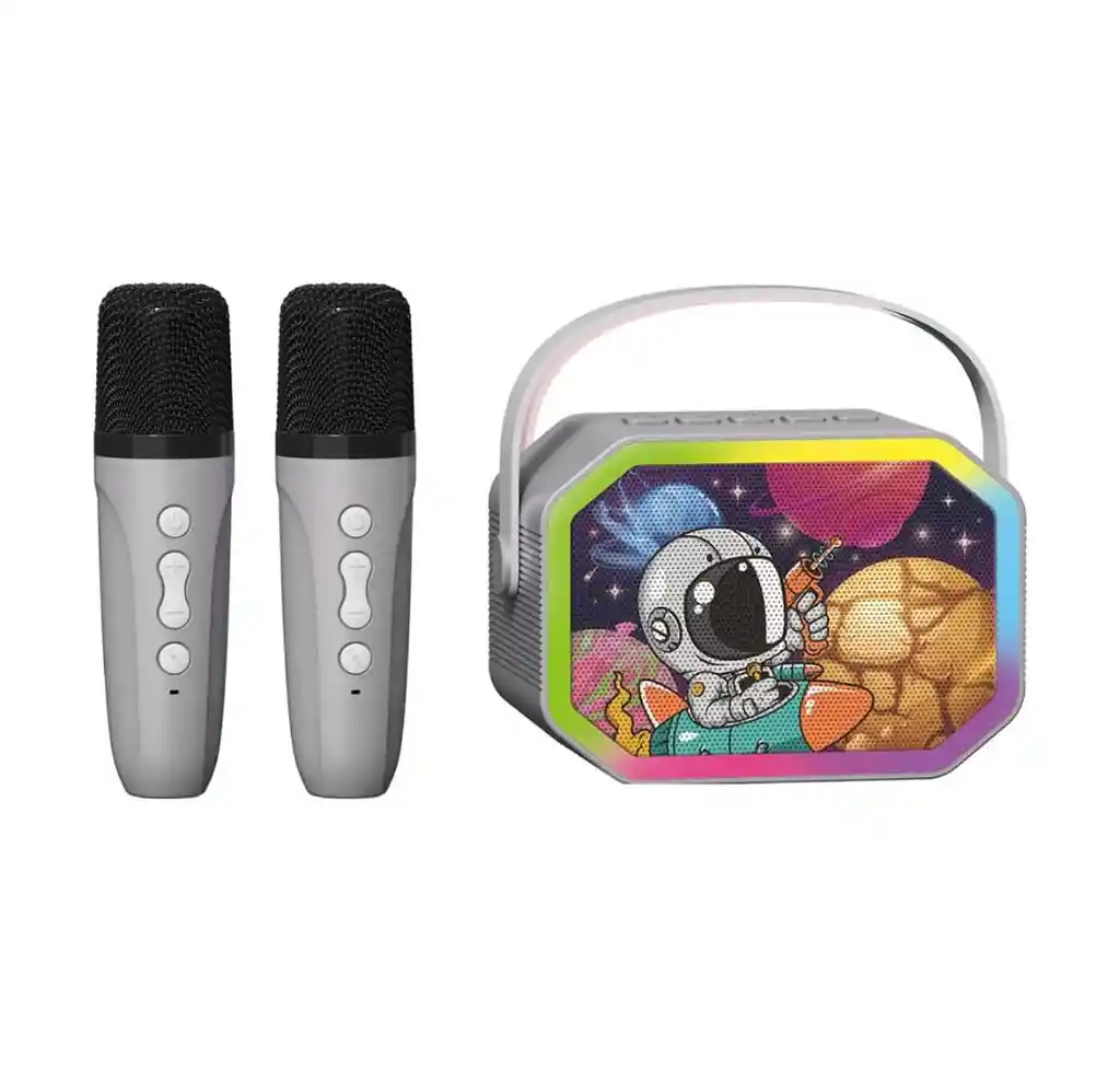 Parlante portátil con diseño infantil espacial -Incluye 2 micrófonos y cable USB -Portátil y ligero, con asa para fácil transporte -Recomendado para niños desde 3 años -Su tamaño práctico y su conexión USB lo hacen fácil de usar en cualquier lugar, perfecto para fiestas, reuniones familiares o juegos en casa. – El parlante cuenta con sonido claro y volumen regulable