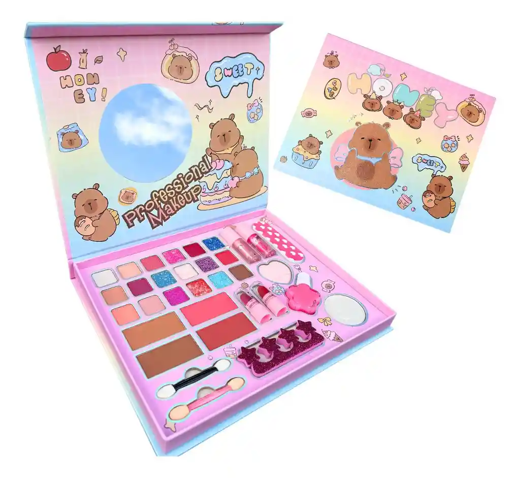 Mundo de Colores, Diversión y Linda! ¡Encanta a las pequeñas con este kit de maquillaje súper completo de la adorable capibara! Perfecto para estimular la creatividad de los niños con seguridad y mucha diversión. Además de hermoso, el kit es todo personalizado con temas lindos y coloridos que encantan a primera vista. Este increíble kit incluye: -18 Sombras en tonos variados y vibrantes -2 Brillos de labios -2 labiales -1 Polvo compacto con rubor -1 separador de dedos 1 esmalte aplicadores lima