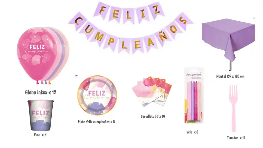 Kit para cumpleaños lila y rosado: 1 feston feliz cumpleaños, 12 globos de latex, 1 paquete de vasos x 8, 1 paquete de platos x 8, servilletas x 16, velas x 8, mantel lila y tenedores rosados