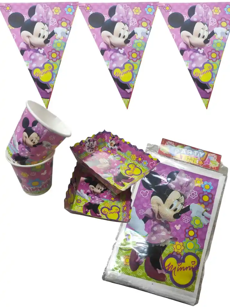 decoracion de minnie mouse 1 banderin con la tematica 10 vasos de carton 10 platos de carton si deseas algo adicional indicanos