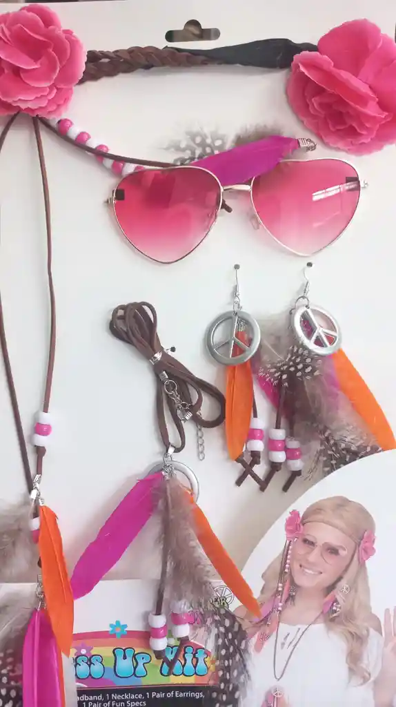 Kit Disfraz De Hippie, Diadema, aretes, collar, gafas - Halloween