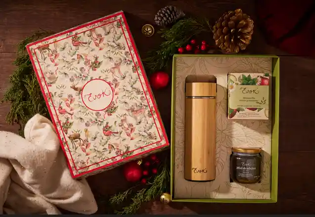 El Kit Dulce respiro incluye: *Termo de bambú con infusor *Miel de abejas de origen vichada *Infusión a granel manzanilla hierbabuena, manzana (100 g) * Caja de regalo decorativa de Navidad