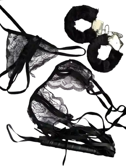 Kit erótico, déjate llevar en la intimidad de tu pareja ,sométete a la voluntad de tu pareja y dominal@ Lleva al limite tus sentidos con este kit de esposas, tapa ojos y látigo Incluye: 1 Látigo de cuero. 1 Par de esposas . 1 brasier 1 tanga