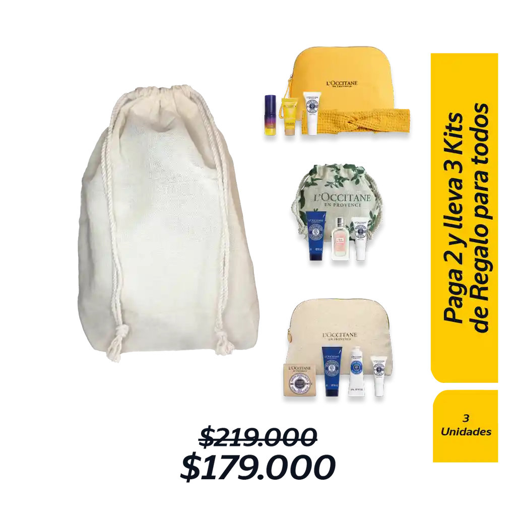 ¡Pague 2, Lleve 3 Kits exclusivos!. Este conjunto premium te ofrece una experiencia de cuidado personal inigualable, combinando lo mejor de nuestras líneas más queridas. Adquiriendo este kit, te llevas tres Kits distintos Kit Cuidado Corporal para Ella que contiene: Crema corporal Ultra Rica de Karité 20ml, Eau de Toilette Flor de Cerezo 7,5ml, Bálsamo para Labios Karité 4g, Bolsito Hojitas L’Occitane. Kit Facial para Ella que contiene: Sérum Facial Immortelle Reset 5ml, Crema hidratante Immortelle Divina 4ml, Bálsamo para Labios Karité 4g, Balaca en tela amarilla, Bolsito Amarillo L’Occitane. Kit Rutina Corporal Karité que contiene: Jabón Sólido Karité Leche 50g, Crema Corporal Ultra Rica Karité 20ml, Crema para manos Karité 30ml, Bálsamo para Labios Karité 4ml, Bolsito Blanco L’Occitane. Todos estos kits vienen dentro de un Bolsito Blanco L’Occitane.