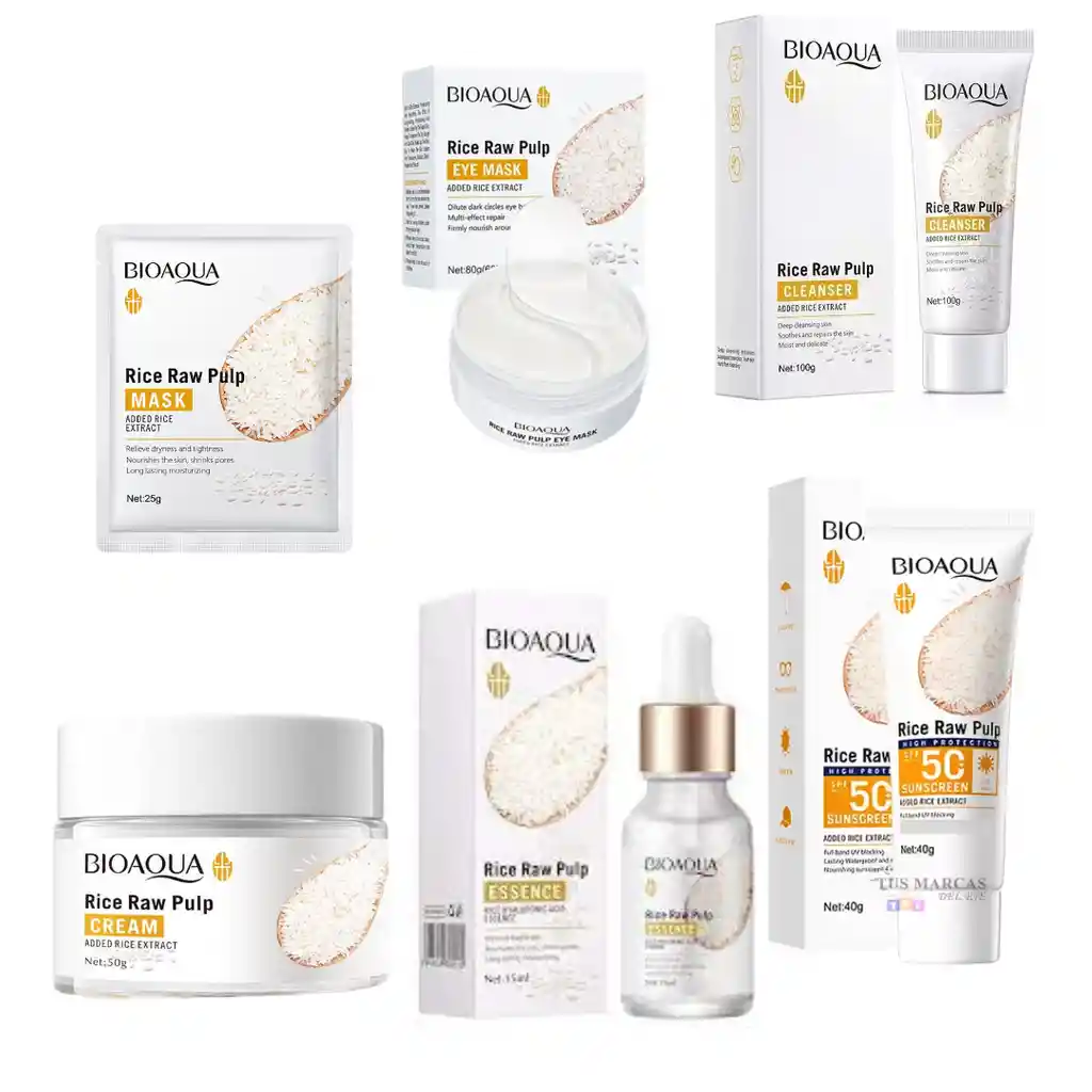 Somos LUNERASTOREBOGOTA una tienda donde encontrarás diversos productos para el cuidado diario de tu piel, maquillaje, así como accesorios para el cabello y complementos para tus rutinas de skin care. Envíos 100% seguros a nivel nacional. 1 Kit Facial Arroz Bioaqua. Contenido 6 Productos Kit Facial Arroz Bioaqua 6 Productos Incluye: 1 Jabón Facial Arroz 100g. 1 Velo Facial Arroz Bioaqua 25g. 1 Serum Facial de Arroz Bioaqua 15ml. 1 Bloqueador Arroz Bioaqua SPF50. 1 Crema Facial Arroz Bioaqua 50g. 1 Colágeno de Ojos Arroz Bioaqua 60u. Modo de Uso Diario: Paso 1: Luego de lavar el rostro, Paso 2: Aplique el serum Facial. Paso 3: Aplicar la crema hidratante. Paso 4: Aplicar el bloqueador. Recomendación: Entre la aplicación de un producto y otro se recomienda dejar actuar de 2 a 4 minutos para aplicar el siguiente. Recuerda que el kit es de uso nocturno. Si deseas usarlo de día debes aplicar bloqueador y no exponerte al sol. Colágeno de ojos: aplicar 2 o 3 veces a la semana de 15 a 20 minutos, luego retirar. Los beneficios del arroz blanco son innumerables pero los más notorios son que remueven la piel muerta que se acumula en los poros, dejando que los aceites naturales del cuerpo hidraten y le den vida a la dermis. El arroz es rico en vitaminas del complejo B, vitamina E, magnesio, manganeso, calcio y potasio. Nuestra piel absorberá estas sustancias desde la primera aplicación y con constancia se podrán obtener grandes resultados. El arroz tiene propiedades aclarantes, es decir que unifica tono de piel.