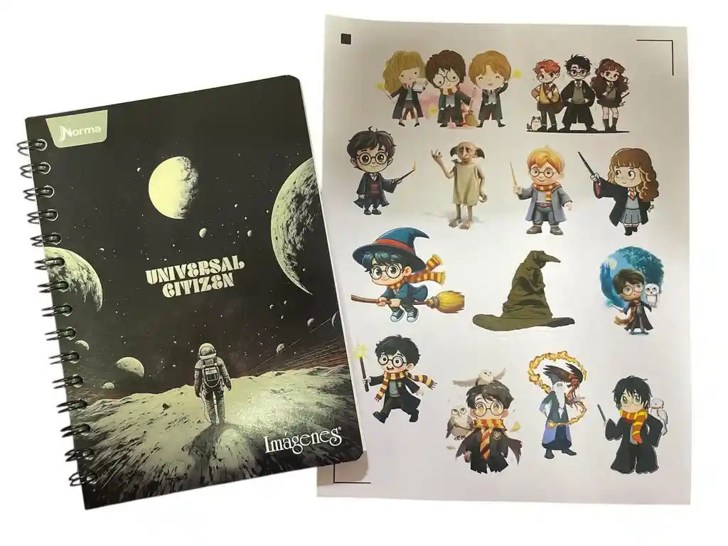 ¡El regalo perfecto para fans de la magia! ⚡🏰 En este kit recibes: ✨1 Cuaderno Argollado Pequeño: Con hojas cuadriculadas y doble anillo metálico. ✨1 Planilla de Stickers Premium Harry Potter: Vinilo UV de alta resistencia con tus personajes y escudos favoritos. Nota: Puedes elegir cualquier motivo de cuaderno de nuestra tienda. ¡Escríbenos al chat de la orden apenas compres! 📲315 388 0960
