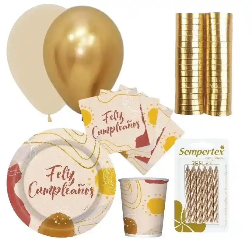El kit incluye: 10 globos fashion arena, 5 globos Reflex Cromado Dorado, 2 serpentina dorada, 8 platos, 8 vasos, 16 servilletas y 1 paquete de velas espiral dorada x 6 uds. Los globos se envian desinflados