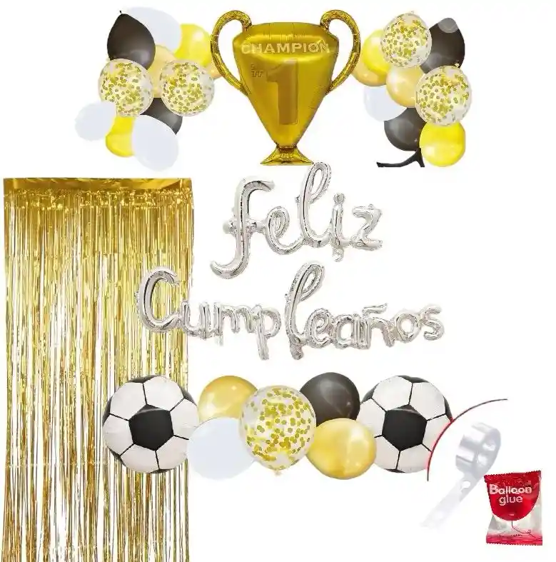 El kit incluye más de 70 piezas: * 25 Globos de látex negro * 20 Globos de látex blanco * 15 Globos de látex dorado * 5 Globos de látex transparentes relleno de confeti * 1 Feliz cumpleaños plateado letra cursiva * 1 Globo metalizado copa champion * 2 Globos metalizados de balon fútbol * 1 Cortina de tiras dorada * 1 Cinta para arco de globos * 1 Pegante para globos