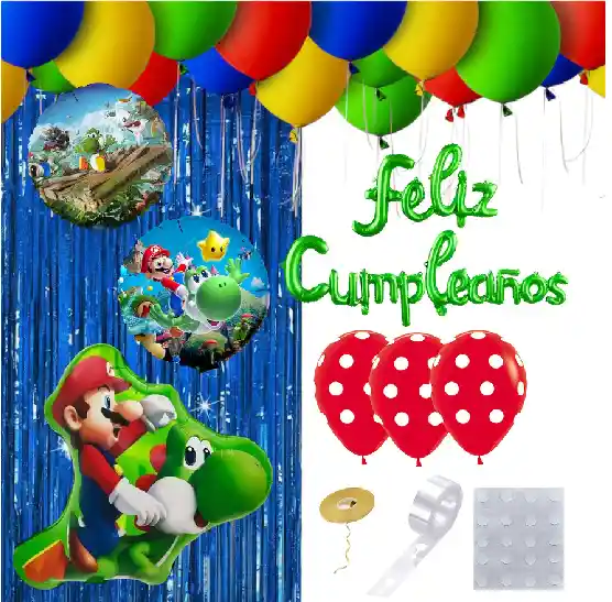 SE ENVÍA SIN INFLAR. El kit incluye 70 piezas: * 30 Globos de látex colores surtidos 10 pulgadas ( Verde, amarillo, rojo y azul) * 25 Globos de látex colores surtidos 5 pulgadas ( Verde, amarillo, rojo y azul) * 2 Globos de látex 12 pulgadas (amarillo y rojo) * 3 Globos de látex polka Rojo * 1 Feliz cumpleaños inflable verde letra cursiva * 1 Globo metalizado Mario * 2 Globo metalizado redondo estampado Mario * 1 Cortina de tiras azul * 1 Cinta para arco de globos * 1 Pegante para globos * 1 Cinta dorada para globos
