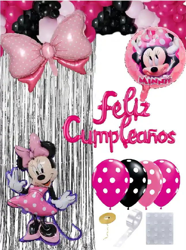 SE ENVÍA SIN INFLAR. El kit incluye 70 piezas: * 30 Globos de látex colores surtidos 10 pulgadas ( Rosado, negro y fucsia) * 24 Globos de látex colores surtidos 5 pulgadas ( Rosado, negro, fucsia) * 2 Globo de látex (Fucsia y rosado) 12 pulgadas * 4 Globos de látex polka * 1 Feliz cumpleaños inflable fucsia letra cursiva * 1 Globo metalizado Minnie * 1 Globo metalizado redondo estampado Minnie * 1 Globo metalizado lazo * 1 Cortina de tiras Plateada * 1 Cinta para arco de globos * 1 Pegante para globos * 1 Cinta dorada para globos