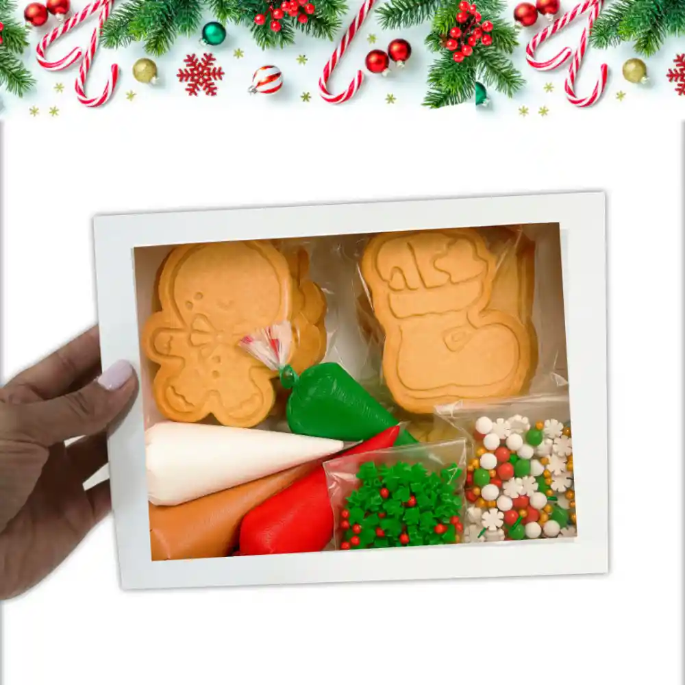 ¡Celebra la magia de la Navidad decorando tus propias galletas! Este kit incluye todo lo que necesitas para disfrutar un momento dulce y creativo en familia: galletas con formas navideñas, glaseados de colores y chispas decorativas. Ideal para niños, adultos y amantes de la repostería que quieren ponerle su toque personal a cada galleta. Las galletas tienen un ligero relieve en la superficie que sirve como guía, lo que facilita la decoración y permite obtener diseños más definidos KIT INCLUYE: Galleta bota (2) Papa noel (2) Bota (2) Reno (2) Arbol (2) Jengibre (2) Glaseado verde-rojo-blanco-Cafe Sprinkles y decoraciones comestibles.