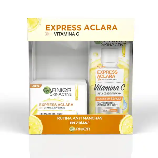 Descubre el poder de la Vitamina C con el Kit Garnier Express Aclara, diseñado para iluminar y revitalizar tu piel de forma rápida y efectiva. Este set incluye dos productos clave que trabajan juntos para reducir las manchas y dar un resplandor natural a tu rostro: Serum Vitamina C Express Aclara (30ml): Un serum ligero y de rápida absorción, enriquecido con vitamina C pura, que combate las imperfecciones y uniformiza el tono de la piel. Su fórmula de acción concentrada revitaliza la piel, ayudando a aclarar las manchas oscuras y a promover una apariencia más radiante y fresca. Crema Día Express Aclara (50ml): Una crema hidratante diaria que complementa el tratamiento del serum, con una fórmula diseñada para iluminar la piel desde la primera aplicación. Su textura suave y ligera proporciona hidratación mientras combate las señales de fatiga y mejora la luminosidad de la piel. Ambos productos están formulados para actuar de manera express, brindando resultados visibles en poco tiempo. El Kit Garnier Express Aclara es ideal para quienes buscan una rutina rápida y efectiva para lograr una piel más clara, iluminada y con un tono más uniforme. ¡Disfruta de una piel más fresca y luminosa todos los días