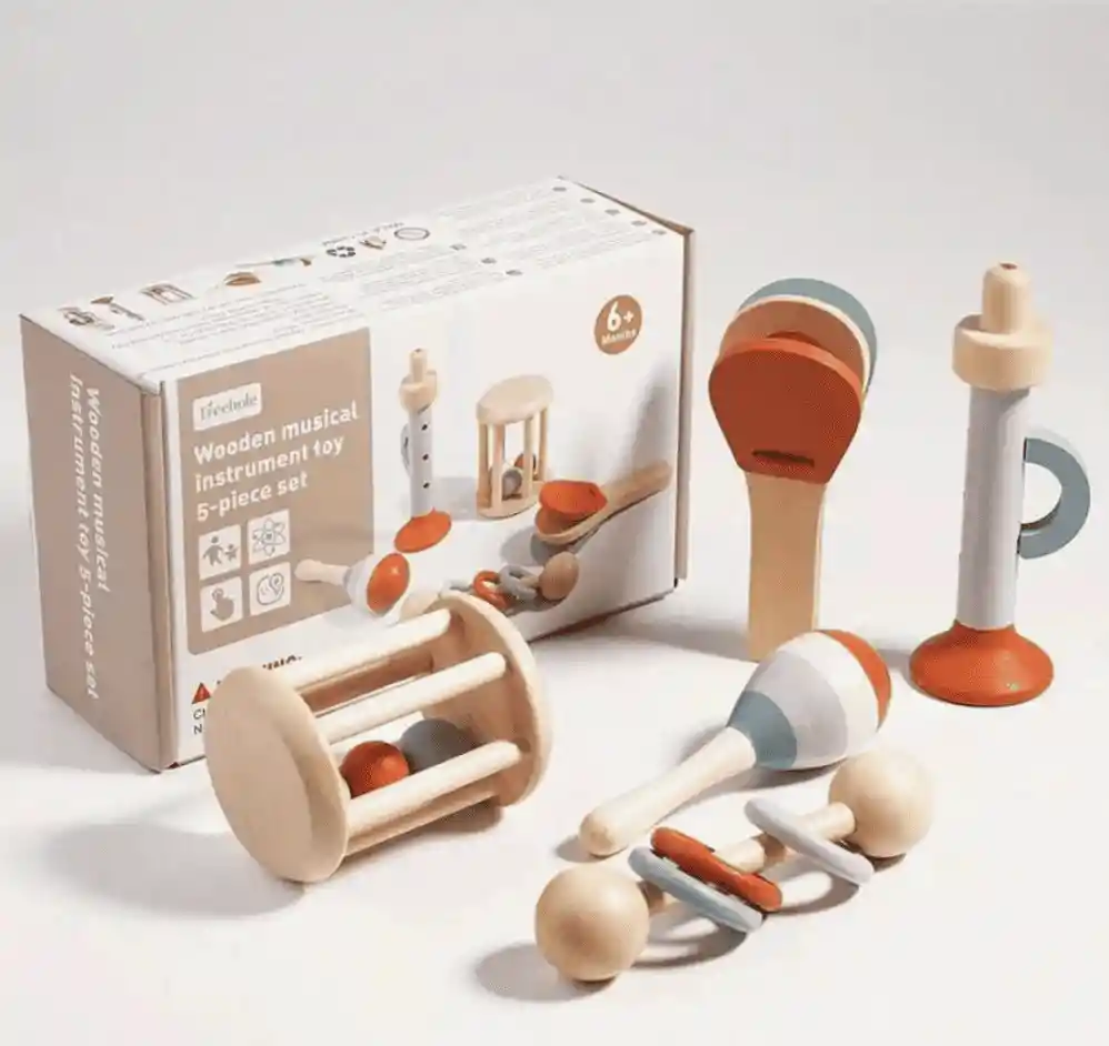Set de instrumentos musicales de madera, diseñado para el aprendizaje temprano y la estimulación sensorial de bebés y niños. Con diferentes instrumentos de percusión y viento, ideales para desarrollar el sentido del ritmo, la coordinación mano-ojo, la motricidad fina de forma natural y divertida. Incluye: Armónica, Maraca, Sonajero de anillos, Rodillo sonoro, Instrumento de percusión manual. Disponibilidad 1 Kit Medidas aproximadas: Armónica: 13.5 cm de alto x 4.5 cm de ancho Maraca: 11.5 cm de alto x 3.5 cm de diámetro Sonajero de anillos: 13 cm de alto x 3.8 cm de ancho Rodillo sonoro: 8 cm de largo x 6 cm de alto Instrumento de percusión: 12 cm de largo x 5.5 cm de alto