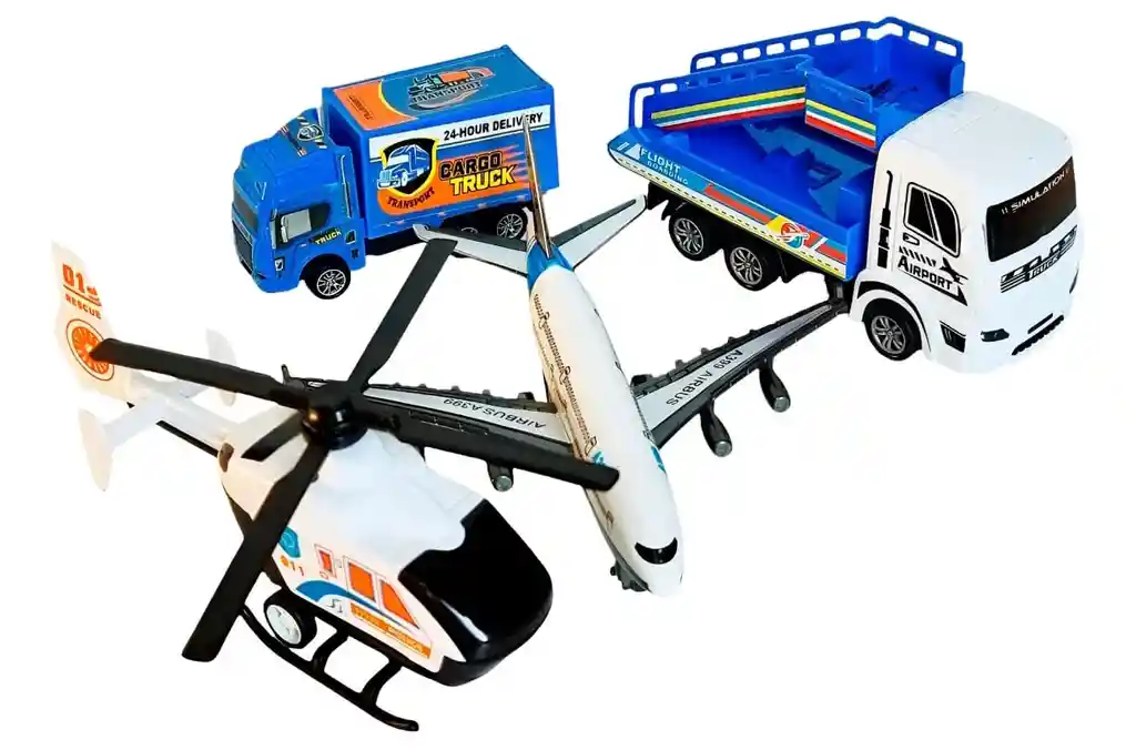 Kit de Juguetes “Simulation Car Model” – Aeropuerto y Rescate | Set Completo Este set de vehículos es perfecto para niños que aman los aviones, los helicópteros y los camiones de trabajo. El kit incluye varios modelos diseñados para recrear escenas de aeropuerto, transporte y rescate, fomentando la imaginación y el juego de roles. Incluye: ✈️ Avión tipo Airbus A399 🚁 Helicóptero de rescate/policía 911 🚚 Camión de carga “Cargo Truck – 24 Hour Delivery” 🛻 Camión con escaleras de aeropuerto (Flight Boarding) Características principales: ✅ Modelos de simulación con diseño detallado ✅ Función pull-back en los vehículos para mayor diversión ✅ Ideal para crear escenarios completos de aeropuerto, rescate y transporte ✅ Material resistente, seguro y apto para niños desde los 3 años ✅ Tamaño compacto y fácil de manipular por los más pequeños Un juguete versátil y educativo que brinda horas de entretenimiento. Perfecto para regalo, colección o juego diario
