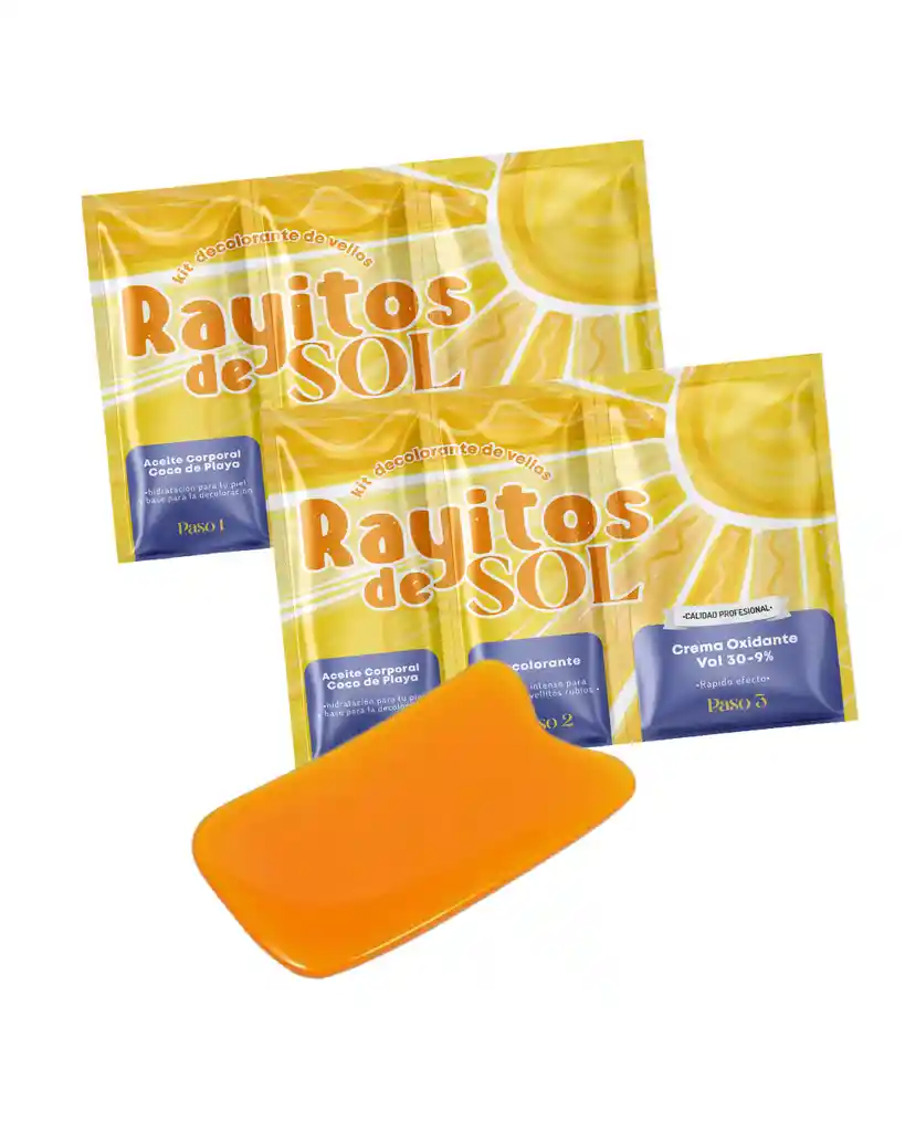 Rayitos de Sol es el kit completo para decolorar el vello corporal, brindando un tono dorado radiante que embellece suavemente el cuerpo con un resplandor vibrante en cada vellito preservando su aspecto natural. Rayitos hidrata y protege el folículo piloso durante el proceso de decoloración, reduciendo en un 99% la irritación dejando una sensación saludable en la piel de tu cuerpo. KIT: 2 Rayitos de Sol + Gua Sha
