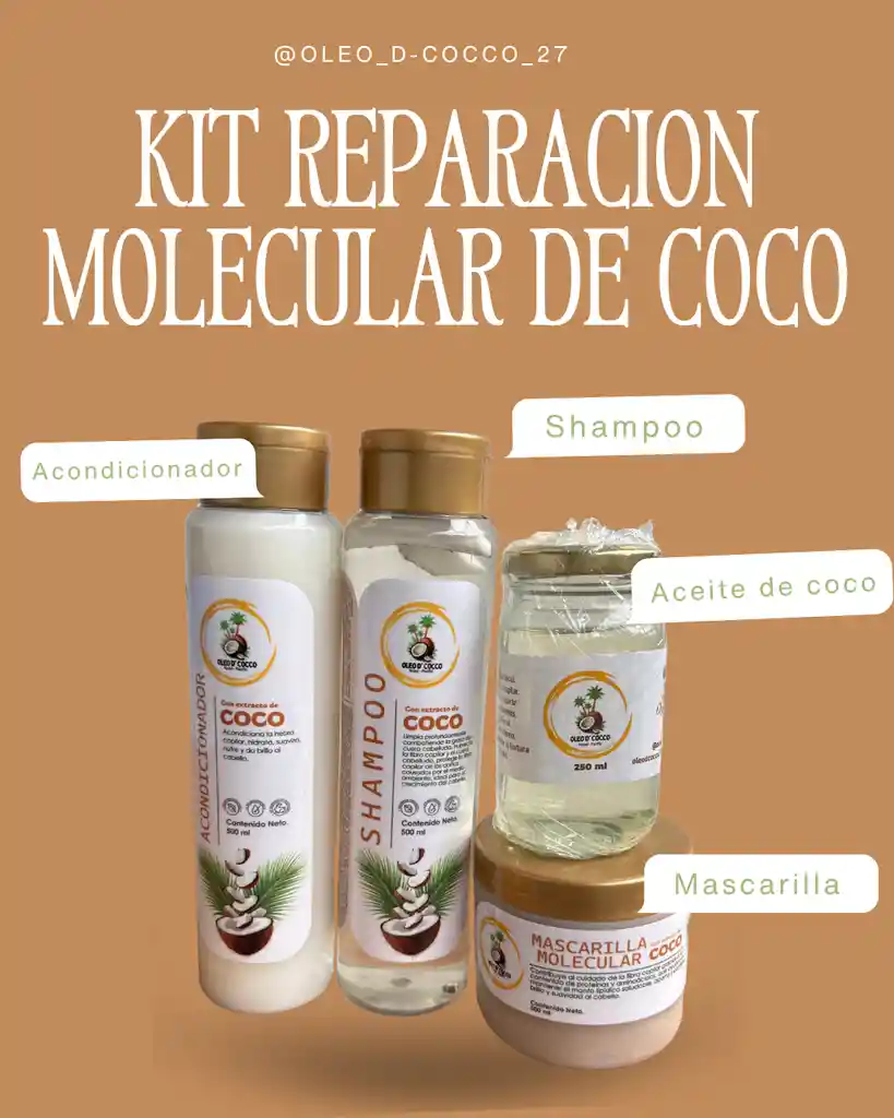 Contiene: SHAMPOO con Extracto de coco 500ml: -Limpia profundamente combatiendo la grasa del cuero cabelludo. -Humecta la fibra capilar y el cuero cabelludo. -Protege la fibra capilar de los daños causados por el medio ambiente. -Ideal para el crecimiento del cabello. Ideal para el crecimiento del cabello. ACONDICIONADOR con Extracto de coco 500ml: -Acondiciona la hebra capilar . -Hidrata, suaviza, nutre y da brillo al cabello. MASCARILLA con Extracto de coco 300ml: *Contribuye al cuidado de la fibra capilar. *Contiene proteínas y aminoácidos. *Ayuda a mantener el manto lipídico saludable. *Aporta y confiere brillo y suavidad al cabello. *El uso continuo ayuda a reparar el maltrato del cabello y prevenir daños ocasionados por exceso de secador, planchas y procedimientos químicos. ACEITE DE coco 50ml: Mantiene tu cabello radiante, sano, fuerte, hidratado, reduce el frizz, protege contra rayos solares, sella tus puntas, promueve el crecimiento de tu cabello.
