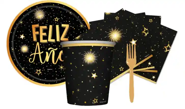 Kit plato, vaso, servilleta y tenedor feliz año