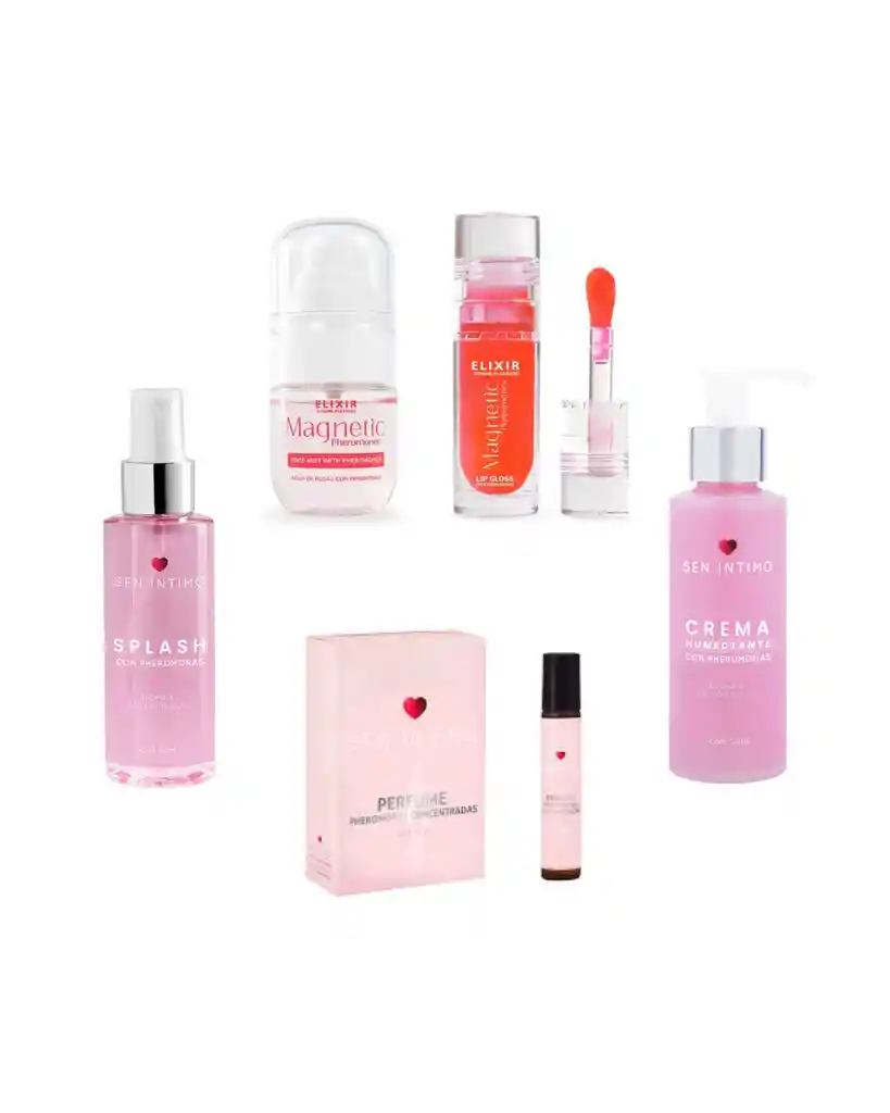 🔥 Kit Premium – Magnetismo Total Incluye: ✨ Splash con feromonas de Sen Íntimo 💧 Crema hidratante con feromonas de Sen Íntimo 🌹 Agua de rosas con feromonas de Elixir 💄 Lip gloss con feromonas de Elixir 🌺 Feromonas concentradas dama roll on de Sen Íntimo El kit más completo para potenciar tu magnetismo al máximo. Combina fragancias seductoras, cuidado profundo de la piel, labios irresistibles y feromonas concentradas para aplicar en puntos clave y dejar una presencia inolvidable. Ideal para citas especiales o noches importantes