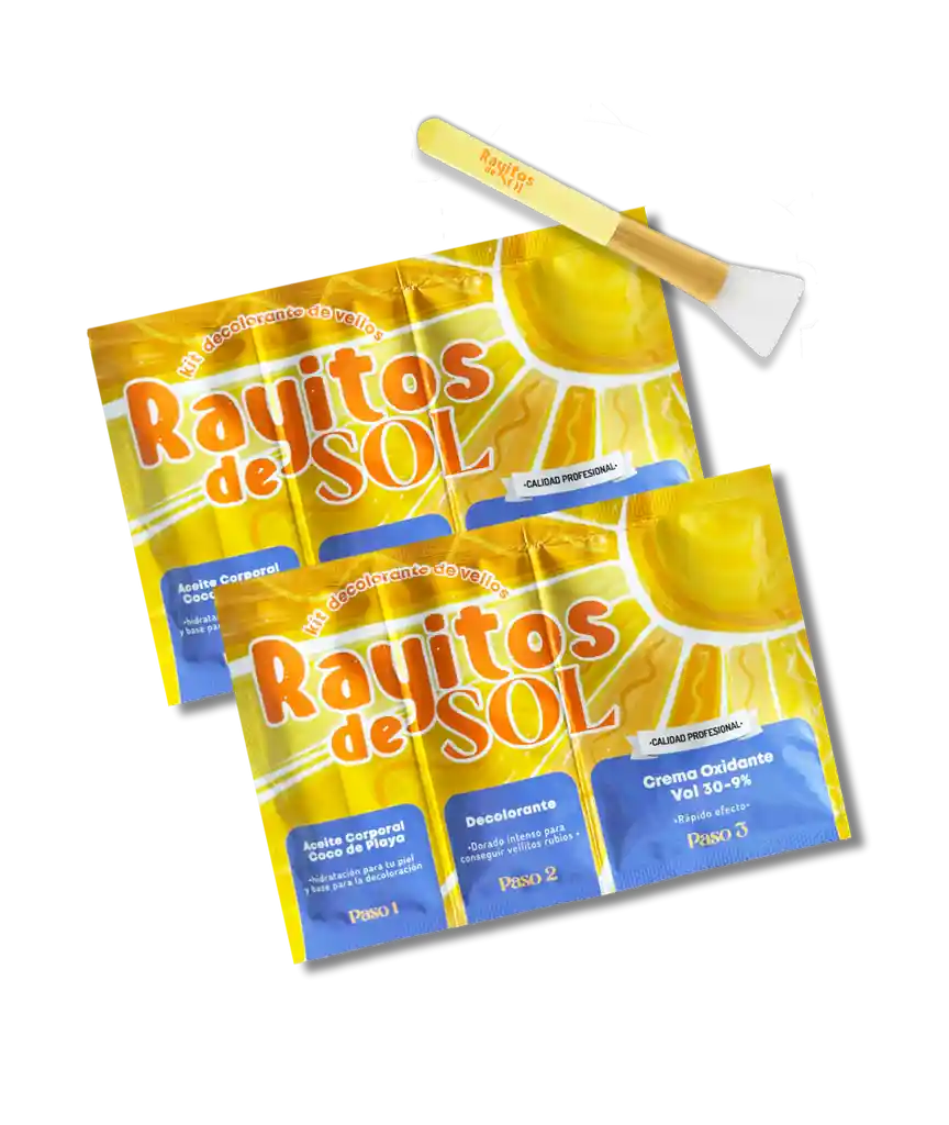 Rayitos de Sol es el kit completo para decolorar el vello corporal, brindando un tono dorado radiante que embellece suavemente el cuerpo con un resplandor vibrante en cada vellito preservando su aspecto natural. Rayitos hidrata y protege el folículo piloso durante el proceso de decoloración, reduciendo en un 99% la irritación dejando una sensación saludable en la piel de tu cuerpo. KIT: 2 Rayitos de Sol + 1 Pala Aplicadora + Hoja de stickers