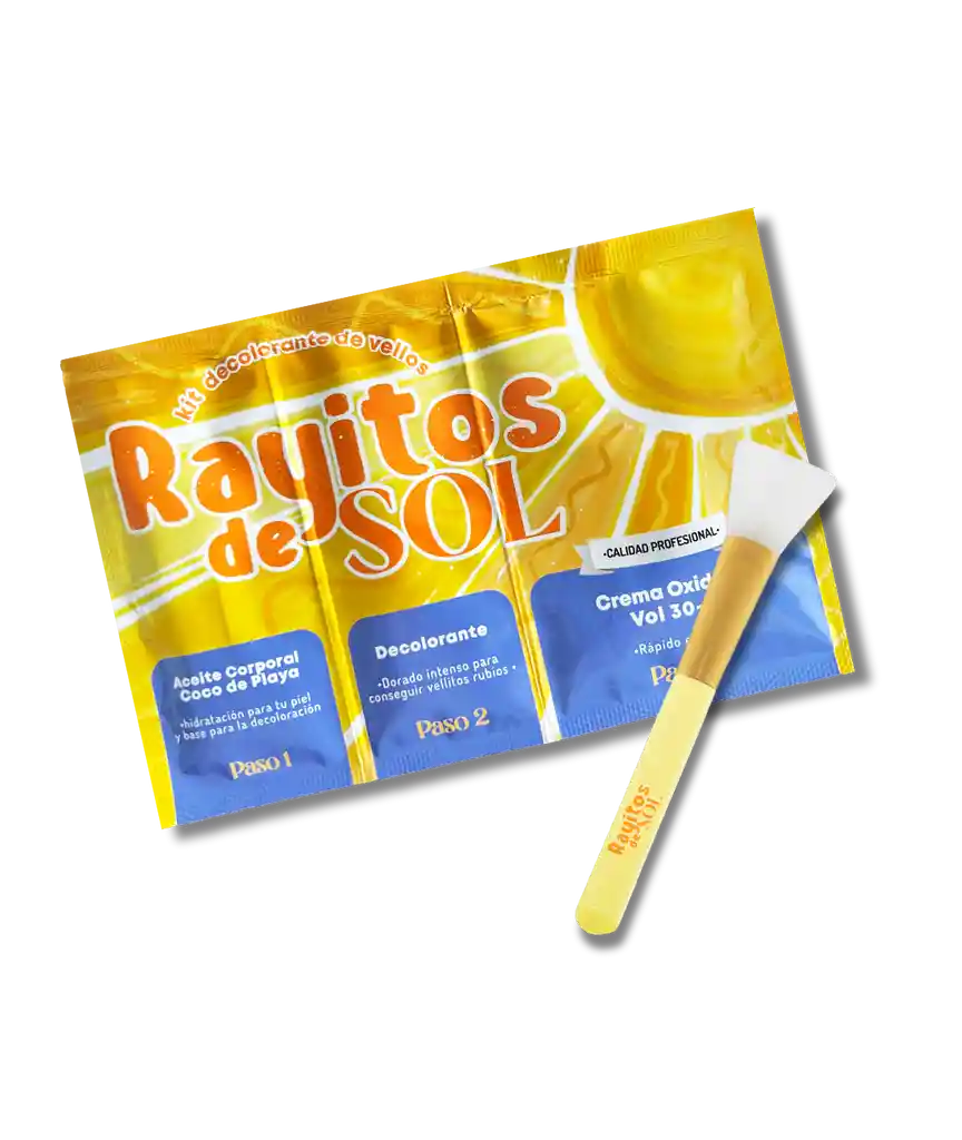 Rayitos de Sol es el kit completo para decolorar el vello corporal, brindando un tono dorado radiante que embellece suavemente el cuerpo con un resplandor vibrante en cada vellito preservando su aspecto natural. Rayitos hidrata y protege el folículo piloso durante el proceso de decoloración, reduciendo en un 99% la irritación dejando una sensación saludable en la piel de tu cuerpo. KIT: 1 Rayito de Sol + 1 Pala Aplicadora + Hoja de stickers