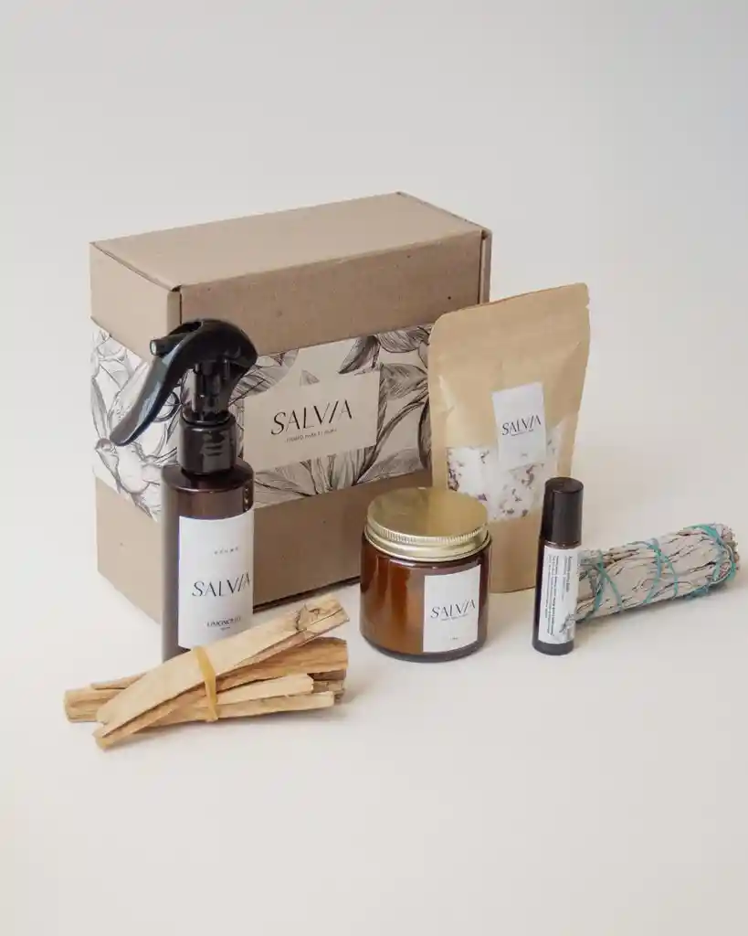Un kit diseñado para crear un ambiente de calma, intención y renovación en casa. Ideal para regalar o disfrutar momentos de pausa, conexión y cuidado personal desde una experiencia sensorial y simbólica. Cada elemento ha sido seleccionado para ambientar espacios, acompañar rutinas de relajación y crear atmósferas armoniosas en el hogar. Incluye: 🛁 Sal de baño con pétalos y hierbas – para un momento de relajación y descanso. 🌫️ Bruma aromática para ambientes – ideal para perfumar y refrescar espacios. 🕯️ Vela decorativa de soja con cuarzos – aporta una luz cálida y una atmósfera especial. 💆♀️ Roll on aromático – práctico para llevar y disfrutar su aroma en cualquier momento. 🔥 Palo santo y salvia blanca – tradicionalmente usados para ambientar espacios. Un detalle especial para crear momentos conscientes, espacios tranquilos y experiencias de bienestar en el hogar.
