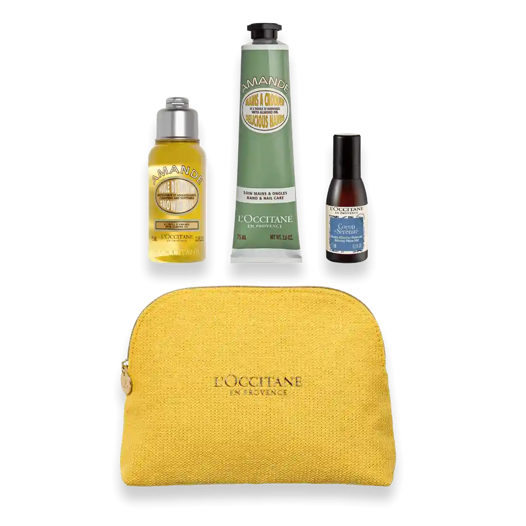 Este kit contiene: Aceite de Ducha Almendras 75ml, Crema para Manos Almendras 75ml, Bruma relajante para almohada Cocon& Sérénité 15ml, Bolsito Amarillo L’Occitane